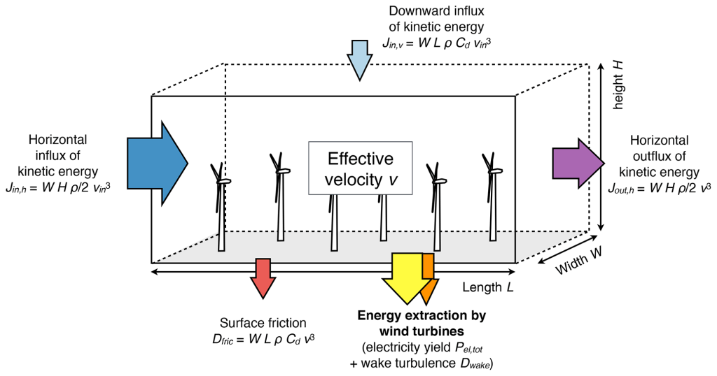 We just published a paper that shows that this wind removal effect of many wind turbines can be accounted for in a rather simple way. The key concept is to account for the fluxes of kinetic energy in the lower atmosphere (the so-called boundary layer), the ones that sustain wind speeds near the surface and drive renewable energy generation. We call our approach the Kinetic Energy Budget of the Atmosphere, or KEBA model (see Figure 1). It accounts for the influxes of kinetic energy from upwind regions (dark blue arrow) and downwards mixing from the atmosphere above (light blue arrow), and the loss terms by surface friction (red arrow), the turbines (yellow arrow) and the losses in their wakes (orange arrow), as well as the downwind export of kinetic energy by the flow (purple arrow).