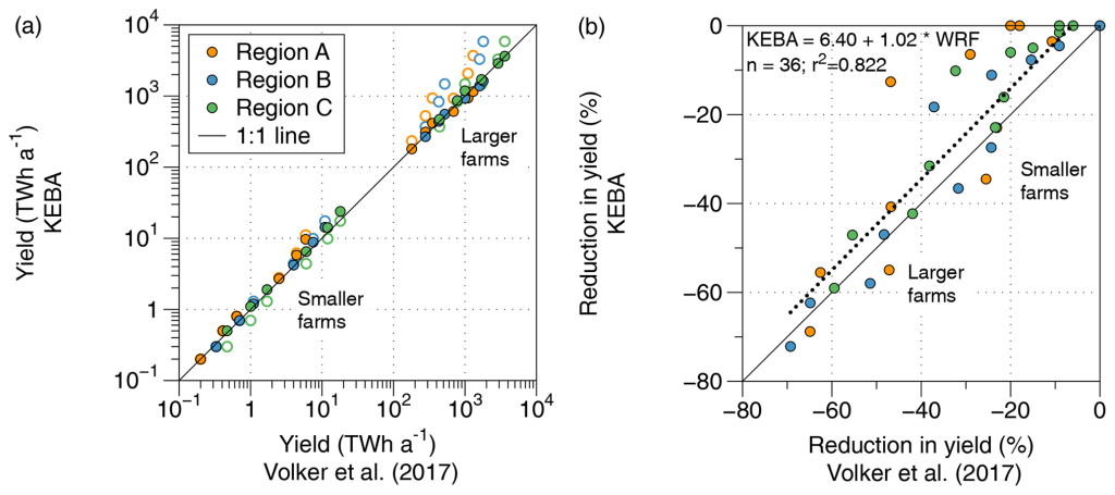 As it turns out, the description of these fluxes depends only on a few parameters, such as the dimensions of the box, the number of turbines, and a meteorological parameter, and, of course, the prevailing wind speed of the region, observed in the natural setting without wind turbines being present. KEBA then simultaneously predicts wind speed reductions as well as the total yield of the turbines. The equations of the model are easy to solve, and were implemented in a spreadsheet. Given the histograms of wind speeds of three contrasting regions, we then compared KEBA to a set of sensitivity simulations done with the WRF regional atmospheric model, published by Volker et al in 2017. The relative yield reductions due to reduced wind speeds is captured surprisingly well, as shown in Figure 2.