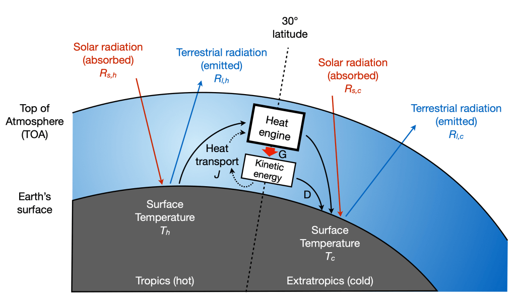 The atmosphere generates kinetic energy out of the difference in absorbed solar radiation between the tropics and the extratropics like a heat engine. Figure 3 in Kleidon (2021).