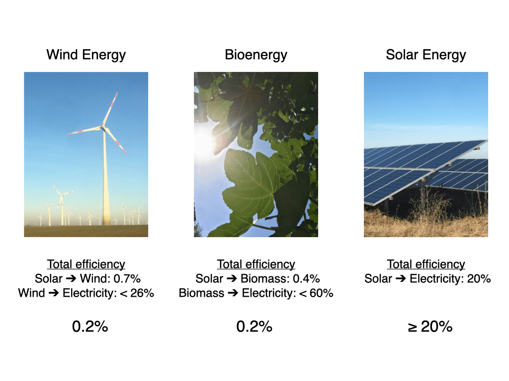 Comparing the total conversion efficiencies from sunlight to electricity for wind, biomass, and photovoltaics. Photovoltaics has by far the highest efficiency because it converts sunlight directly into electricity without an intermediate step of converting it into heat. Figure 9 in Kleidon (2021).