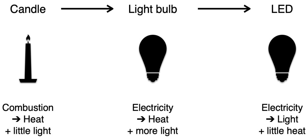 Then came the light bulb. It uses electricity, so no combustion here. The filament gets hotter than the soot particles. So more of the energy is emitted as visible light. A lot of heat is still generated, but it is already more efficient than the candle.