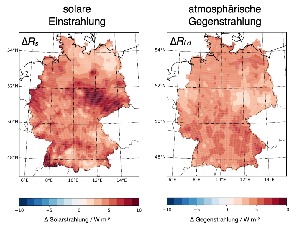 Diesen Ansatz kann man nun nehmen, und die Erwärmung in Deutschland nachrechnen. Das klappt ausgesprochen gut. Damit kann man zeigen, dass etwa die Hälfte der Erwärmung durch die Zunahme des Treibhauseffekts entsteht, die andere Hälfte durch eine Zunahme der solaren Einstrahlung an der Oberfläche (die Änderungen der Strahlungsflüsse sind in Abbildung 6 gezeigt). Die genaue Rechnung wird im Anhang dieses Artikels beschrieben und im unten stehenden Video gezeigt.