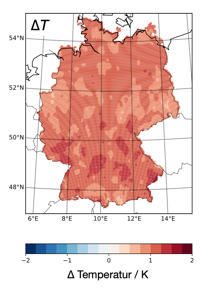 Diese Erwärmung findet man in ganz Deutschland. Dazu habe ich mir den HYRAS Datensatz des DWD angesehen, der auf Wetterstationsmessungen basiert und dies in räumliche Felder erweitert hat. Und da zeigt sich, dass die mittlere Temperatur relativ gleichförmig überall zugenommen hat, und zwar um etwa +1,1 Grad. Also nicht nur in Städten, die Erwärmung sieht man genauso deutlich in der ländlichen Region (siehe z. B. die Wetterstation auf dem Fichtelberg im Erzgebirge, Link hier).
