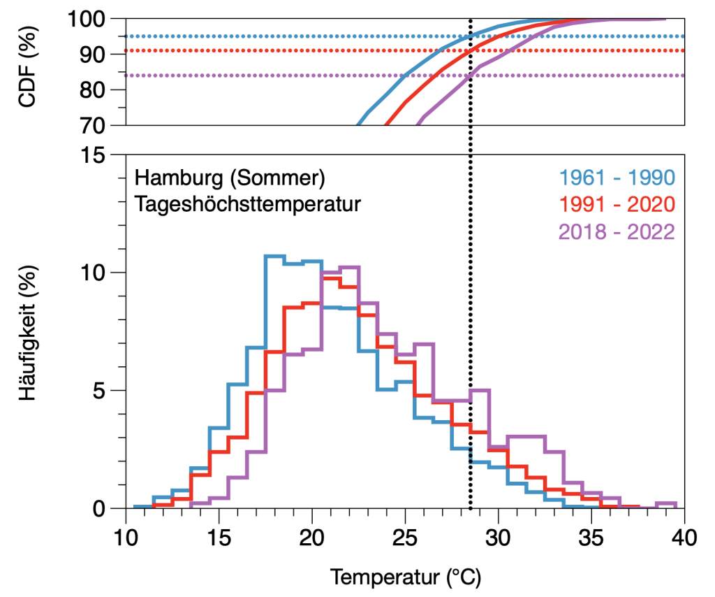 Die extremen Tageshöchsttemperaturen haben derweil kräftig zugenommen. Als ich zur Schule ging, waren es nur 5% der Sommertage, an denen die Tageshöchsttemperatur über 28.5 Grad lag, also etwa 4 Tage (Diese Zahl erhält man, wenn man die Häufigkeiten aufsummiert und nachsieht, wann man 95% überschritten hat – dies ist unten dargestellt als CDF, für cumulative distribution function). Im Zeitraum 1991-2020 waren es schon doppelt so viele Tage, etwa 10%. Und in den letzten 5 Jahren waren es bereits 15% der Tage. Dieser überproportionale Anstieg der extrem warmen Tage liegt letztendlich am exponentiellen Abfall an den Rändern der Gauss-Verteilung, auch wenn die paar Grad mittlere Erwärmung gar nicht so viel erscheinen mögen.
