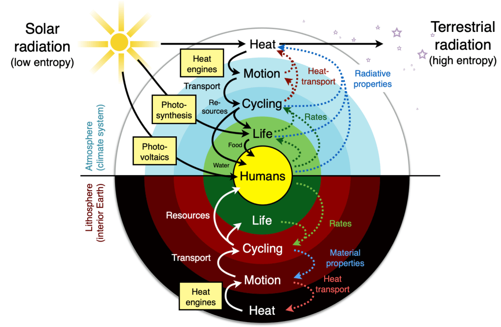 About 15 years ago I published a paper on “Life, hierarchy, and the thermodynamic machinery of planet Earth”. This paper was quite influential for me as it clarified many things about how the second law of thermodynamics applies to the Earth system. It led to quite a few applications of thermodynamic limits in climate science and renewable energy that worked really well and that I found insightful because it allows us to do climate science in a simple yet physically-based way. The follow-up paper just published provides a summary of this approach and explores potential, more concrete applications of how the biosphere optimizes its form and functioning, and on life on Earth and beyond in general.