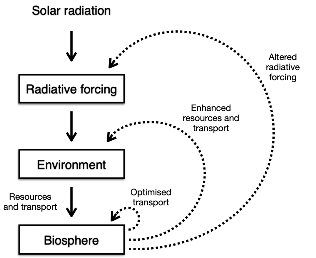 When looking at optimality and maximizing the power of the biosphere, this then shifts the focus on mechanisms that life has to minimize transport restrictions. Less friction means faster transport and cycling, affecting resource availability. This affects the environmental conditions for the biosphere to be productive and generate power from sunlight (Figure 2).