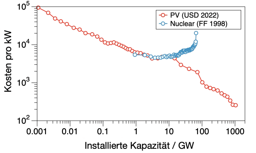 Bei Photovoltaik ist die Lernkurve sehr gut dokumentiert, hier sind die Stückkosten gewaltig gesunken bei steigender Produktion (siehe Abbildung). Bei Kernenergie ist es wesentlich schwerer, an die Kosten zu kommen, zumal die Kosten für Haftung und Endlagerung hohe Unsicherheiten haben und häufig nicht enthalten sind. Es gibt eine Studie zu den Kosten von Kernenergie in Frankreich – sie zeigen eine negative Lernkurve, also eine Zunahme der Stückkosten.