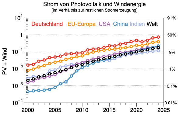 Die Trends in der gesamten Stromerzeugung sind dabei sehr unterschiedlich. In Deutschland sinkt der Stromverbrauch etwa seit 10 Jahren, in China hat er sich über 25 Jahre verzehnfacht, in Europa und den USA ist er relativ konstant. Aber weil wir ja für logistisches Wachstum uns relative Größen ansehen, fallen diese Trends nicht ins Gewicht. Für die Interpretation ist dies trotzdem relevant. Es bedeutet nämlich, dass Kohle und Kernkraft in China noch wachsen, aber eben längst nicht so stark wie die Stromerzeugung aus Photovoltaik und Windenergie.