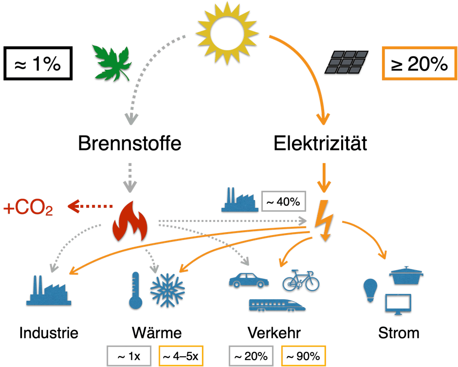 Die Antwort ist einfach: Verbrennung, und allgemeiner, Wärme als Zwischenschritt vermeiden. Strom direkt aus Photovoltaik, nicht aus Verbrennung. Mobilität aus Strom, nicht aus Verbrennung. Raumwärme über Wärmepumpe, nicht aus Verbrennung. Dies ist wesentlich effizienter, wir brauchen dann weniger Energie, um das gleiche Ziel zu erreichen.