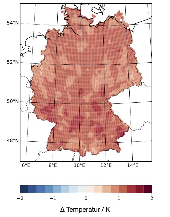 Oder als Karte von ganz Deutschland, für die mittlere Temperatur zwischen den Zeiträumen 1991-2020 im Vergleich zu 1961-1990.