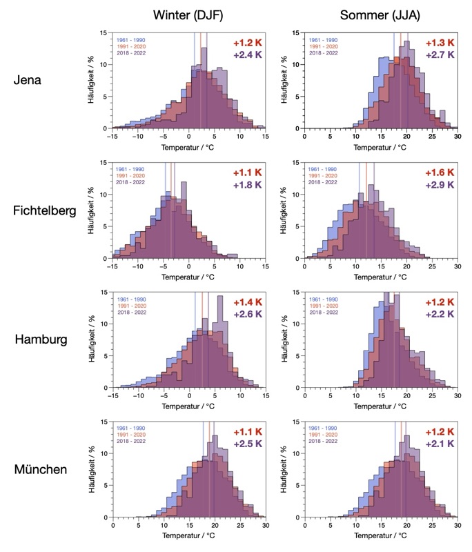 Diese Verschiebungen finden wir natürlich nicht nur in Jena. Hier eine Grafik, die auch Hamburg, München und den Fichtelberg mit einschliesst – für Tagesmitteltemperaturen im Winter und Sommer (entnommen aus dem Anhang dieser Veröffentlichung):