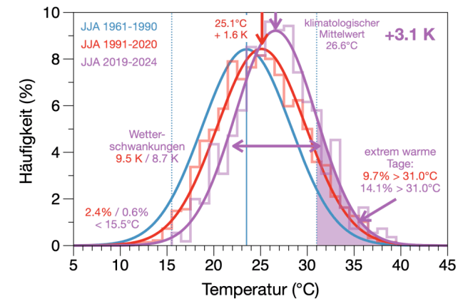 Durch die erhöhten Treibhausgaskonzentrationen nimmt die atmosphärische Ausstrahlung zu, also einer der beiden Absorptionsterme. Auch die Solarstrahlung hat durch weniger Wolken über die letzten 30 Jahre zugenommen. Dies verschiebt systematisch diese Häufigkeitsverteilungen, um +1.6 K für die Jahre 1991-2020, und um +3.1 K für die Jahre 2019-2024. Und so kommen die Temperaturen, die wir als extrem definiert haben, überproportional häufiger vor.