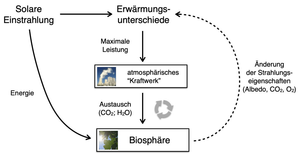 Durch den Austausch von Kohlendioxid kann die Biosphäre aber auch die Zusammensetzung der Atmosphäre ändern. Über die Erdgeschichte hat sie dies auch getan, die Komposition hat sich dramatisch verändert (siehe auch dieses Video). Und so kann die Biosphäre die Strahlungsbedingungen, unter denen Luftbewegung entsteht, entsprechend verändern, und zwar so, dass sie insgesamt leistungsfähiger wird (siehe Abbildung 2). Und da physikalische Prozesse wie Luftbewegung sich gut darüber beschreiben lassen, dass sie an ihrer Leistungsgrenze operieren, können wir spekulieren, dass dies die Biosphäre über die Jahrmillionen der Erdgeschichte ebenso getan hat. Natürlich passiert dies nicht so schnell wie in der Atmosphäre, wo sich dieses Maximum innerhalb von Minuten einstellen kann, sondern es zeigt sich in einem evolutionärem Trend über Jahrmillionen von Jahren.