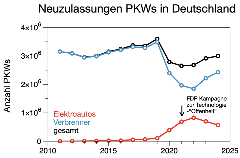 Und in Deutschland? Dort folgte die Verdrängung des Verbrennungsmotors auch erst dem logistischen Wachstum – bis Anfang der 2020er die Populisten der FDP von sogenannter „Technologieoffenheit“ Verunsicherung verbreitet haben und die Entwicklung ausgebremst haben. Was für ein fataler Einfluss von Politik und dummen Gerede! Das logistische Wachstum ist auf jeden Fall gestört, Deutschland ist auf dem Weg, noch weiter hinterher zu hinken, auch wenn es dieses Jahr wieder besser aussieht, die Zulassungszahlen für Elektronautos sind wieder gestiegen.