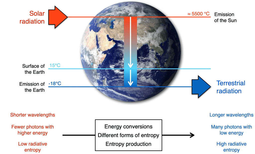 The three forms of entropy are needed to understand energy transformations on Earth, where entropy changes its forms as energy is converted (Kleidon 2010, 2016, 2023). The sun radiates energy into space at very high temperatures. When this radiation reaches the Earth, it has therefore very low entropy – the energy is distributed over comparatively few energetic photons with short wavelengths. The processes of the Earth system convert this energy, as well as the form of entropy, during absorption, emission, heating and cooling, buoyancy, friction, phase transitions, geochemical reactions, and all other processes of the Earth system. When the energy is finally radiated back into space, it is distributed over many more photons, each with lower energy. Thus, entropy increases substantially during these transformations, following the second law of thermodynamics. But, in a way, that is not really surprising, but what you would expect.